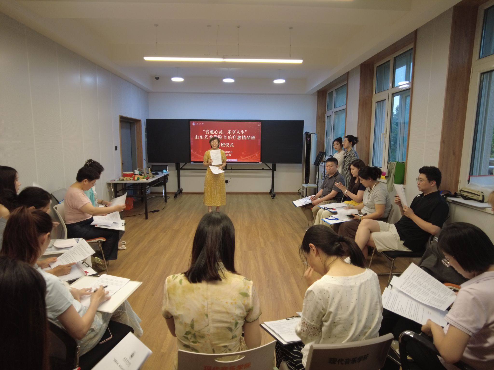 6月17日晚,山东艺术学院“音愈心灵,乐享人生”音乐疗愈精品班开班仪式在文东校区举行,艺术教育集团负责人、主讲教师团队及社会参培学员参加。